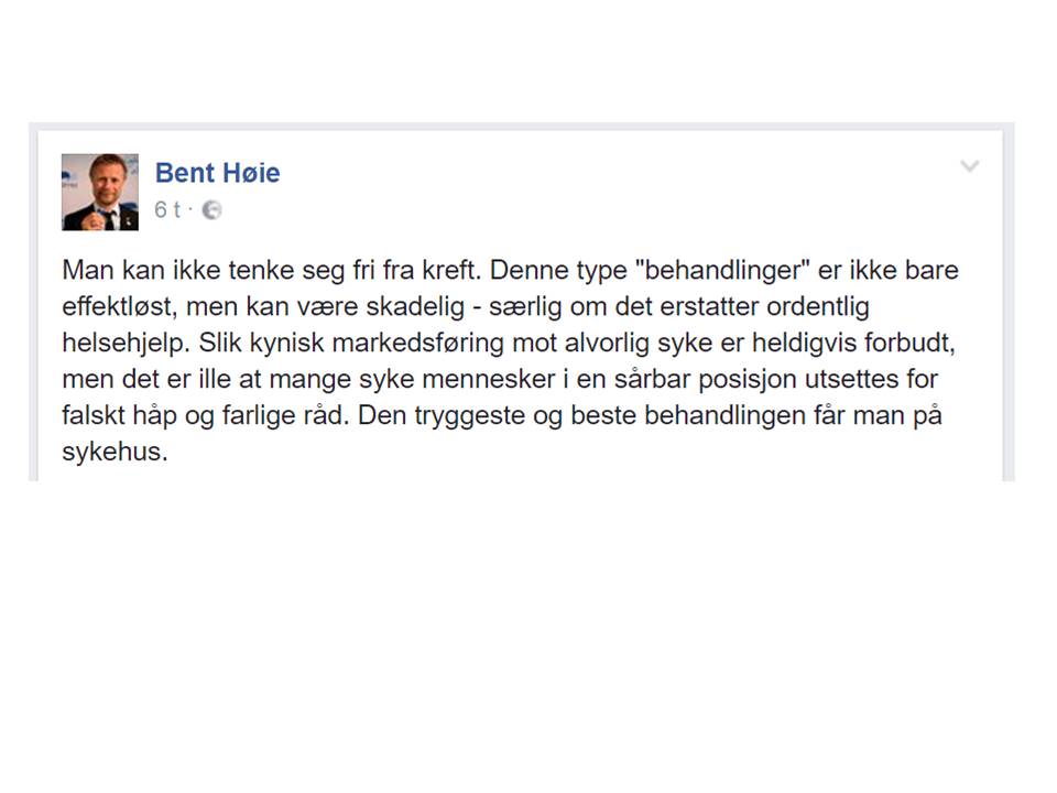 Man kan ikke tenke seg fri fra ME heller. Også andre typer «behandlinger», som Lightning Process, er ikke bare effektløst, men kan være skadelig – særlig om det erstatter ordentlig helsehjelp. Slik kynisk markedsføring som Live Landmark retter mot alvorlig syke ME-pasienter burde også vært forbudt, og det er ille at du tillater at mange syke mennesker i en sårbar posisjon utsettes for falskt håp og farlige råd. Den tryggeste og beste behandlingen burde ME-pasienter fått på sykehus.