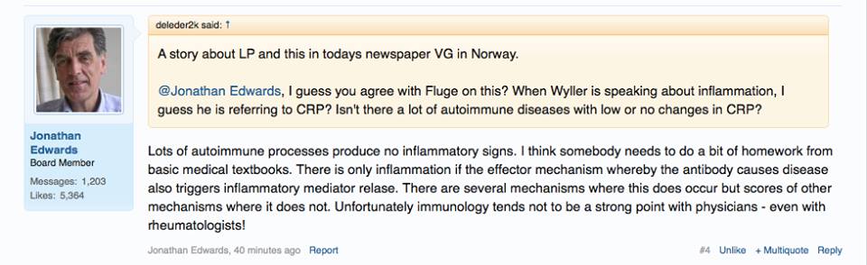 Han glemmer kanskje at også fagfolk får ME – som f.eks. lege Maria Gjerpe som ble frisk fra ME ved hjelp av det immunmodulerende medikamentet Rituximab.