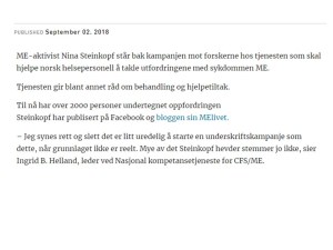 Takk for at du skriver om det pasienter og pårørende ser og vet og ikke greier å få ned på papiret. Takk for at du bryr deg om andre. Og for at du sier fra der de som virkelig har ansvar tier. Nina, det er så godt at du tar opp alt det som forverrer situasjonen for ME-pasienter i helse-Norge. Det er trist å se at lederen i Kompetansetjenesten fremstiller seg selv som mindre vitende om norske pasienter sine opplevelser enn deg Nina pga uttalelsene sine. Hadde lederen offentlig erkjent problemene pasienter melder om til myndighetene og tatt tak i dem tidligere så hadde hun fått respekt. Men når hun bruker ord som «uredelig» når pasienter protesterer mot manglende informasjonsflyt, feilbehandlinger og stygg oppførsel i hjelpeapparatet så er det ikke enkelt å føle tillit, respekt og forståelse. En ledelse som ikke evner å lytte til erfaringer om det som ødelegger helsa til folk, må velges ut til fordel for noen som ser og forstår hvor veien må bygges videre. Takk igjen for at du sier offentlig fra om hva pasienter opplever og prøver å endre situasjonen så de som skaper forverring en dag slutter med det.