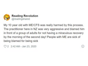De som blir sykere av økt aktivitet enten det gjelder bevegelse eller positiv/negativ tankeaktivitet, må ikke påtvinges behandling som presser dem utover tålegrensa. Å få en Me-diagnose betyr ikke automatisk at pasienten får negative tankestrømmer som må avlæres. En tilfriskningshistorie betyr heller ikke at neste pasient blir bedre av samme fremgangsmåte.