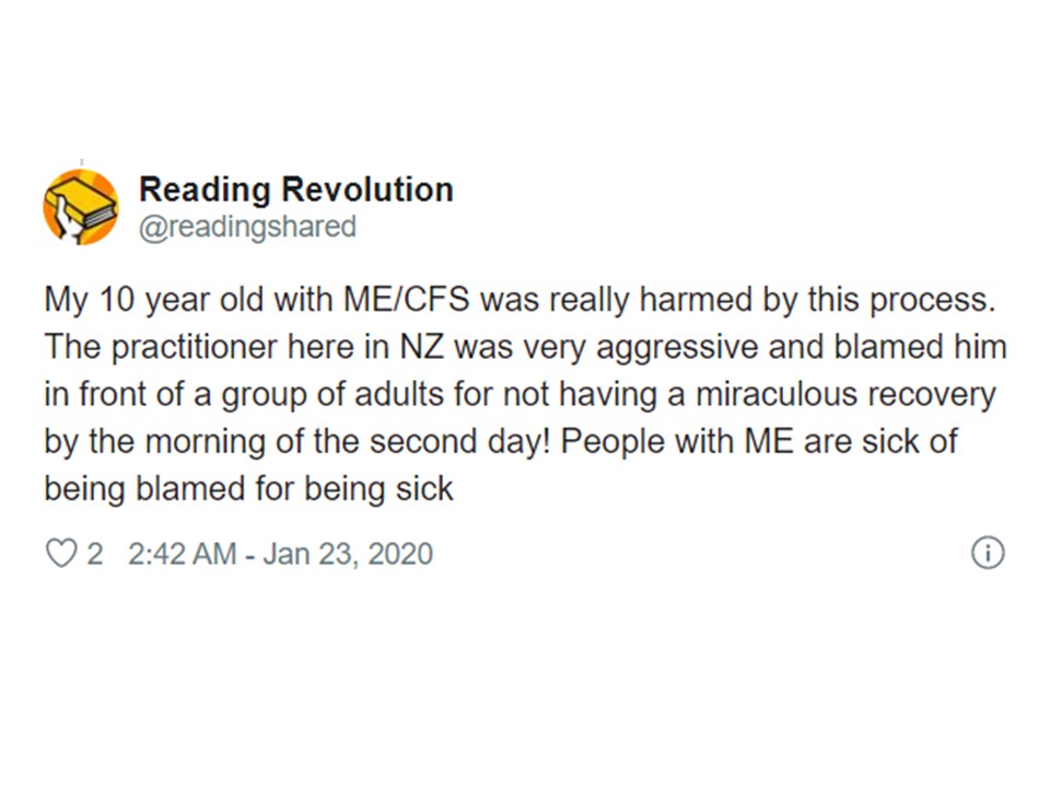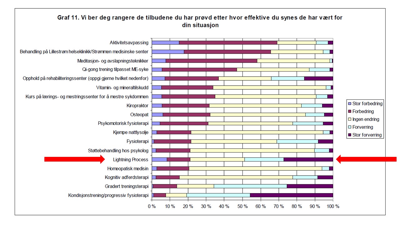 Metoden har vist seg skadelig for ME-pasienter. Ved å støtte studien der 110 ME-pasienter skal ta kurs i Lightning Process bidrar helsemyndighetene til å gi alternativbehandling en medisinskfaglig legitimitet. Prosjektet bidrar også til å spre usikkerhet om hva ME er, og å opprettholde ideen om at ME-syke er en stor og sammensatt gruppe mennesker som er «utmattet». Pasientene blir sviktet av de instansene som er ment å ivareta dem, og som skal sikre at behandling er fundert på god og solid forskning.