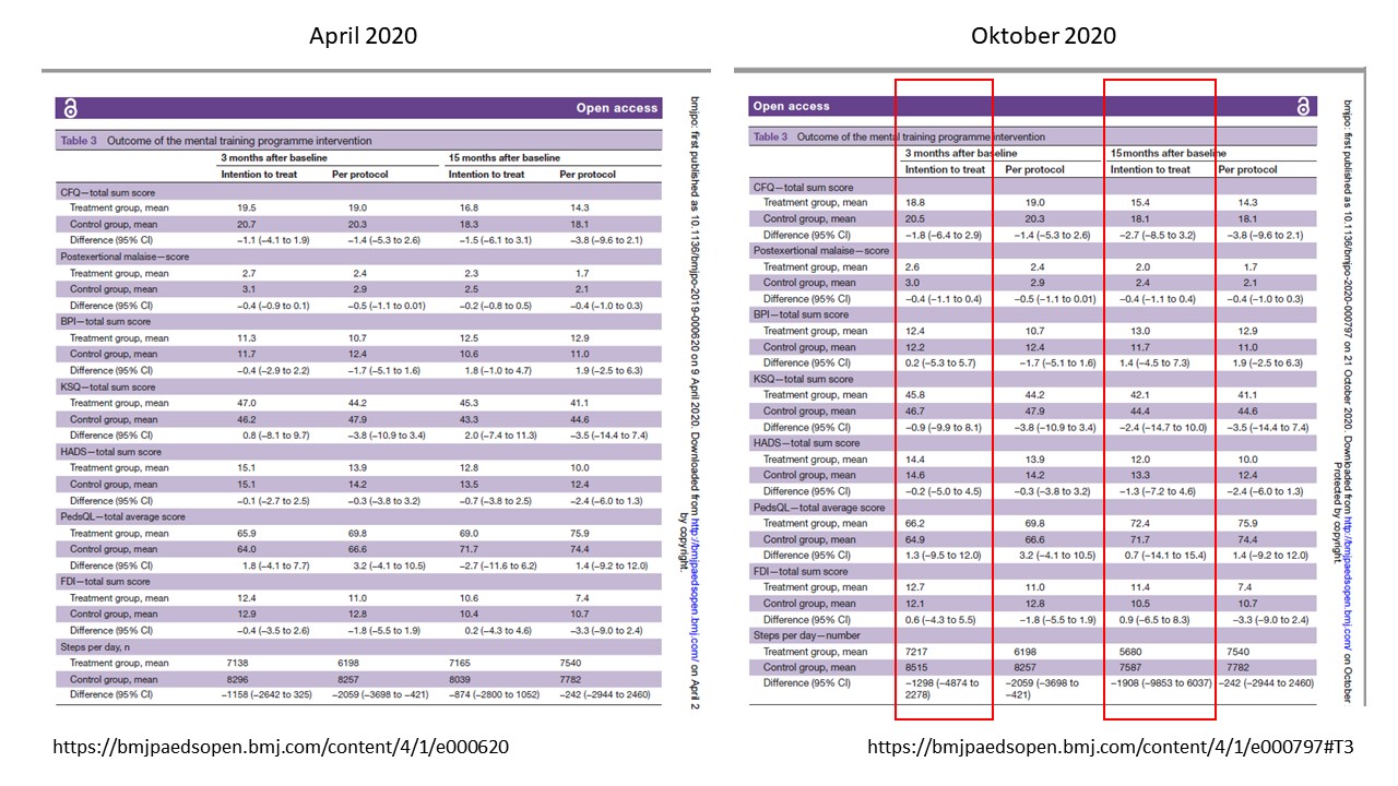 The original article states that the number of steps/day tended to decrease, whereas postexertional malaise tended to improve in the intervention group at 3 months. At 15 months’ follow-up, there was a trend towards higher recovery rate in the intervention group.