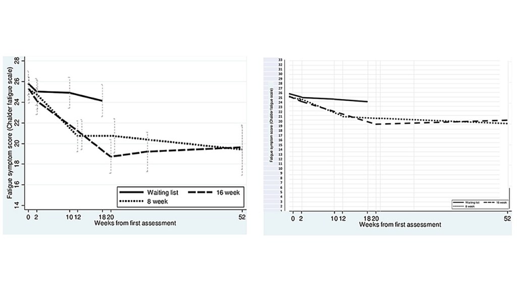 Figur 3 til venstre “Sekundært utfall, utmattelse (CFQ) opp til 52 uker” viser resultatene i en avkortet skala fra 14 – 28. Figuren til høyre viser resultatene lagt inn i hele skalaen fra 1-33.