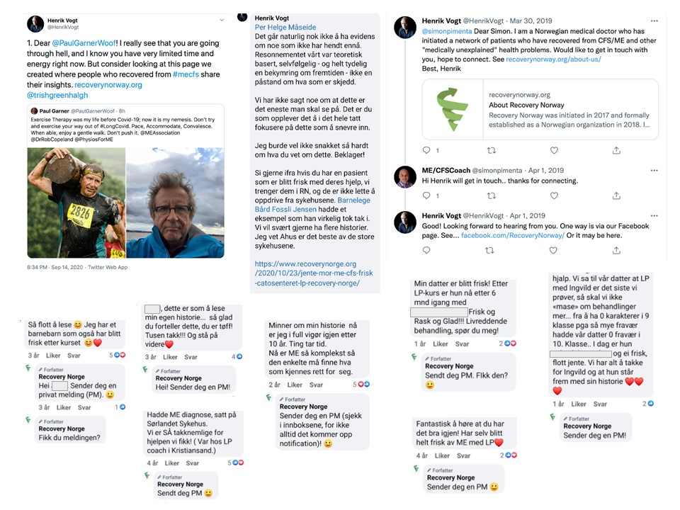 LP-organisasjonen Recovery Norge (RN) har pr. d.d. publisert 62 historier om ME og LP på sine nettsider. Kun 30 av disse er navngitte norske personer med en bekreftet ME-diagnose. De resterende er uten bekreftet ME-diagnose, folk fra andre land, anonyme historier og gjentakelser; historier fortalt 2 og 3 ganger.