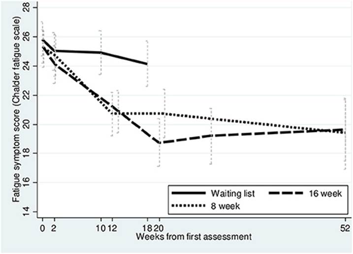 Figur 3 i artikkelen “Sekundært utfall, utmattelse (CFQ) opp til 52 uker” viser resultatene i en avkortet Y-akse fra 14 – 28: