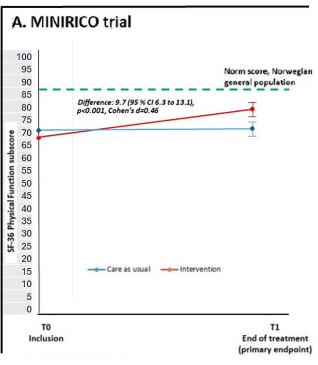 Grensen for klinisk betydningsfull endring for de respektive SF-36 er 10 poeng i henhold til forskerne selv. Begge studiene fikk 9.x i forskjell mellom gruppene. Det vil si at resultatene av SF-36 er under grensen for klinisk betydningsfull endring.