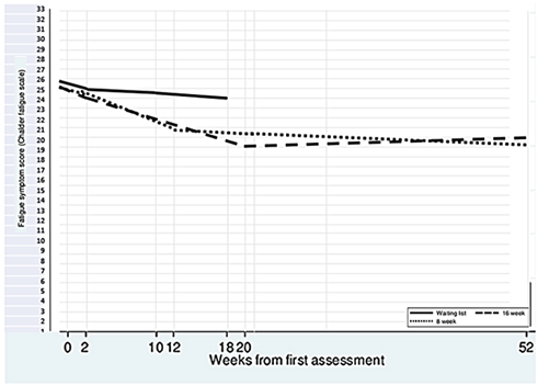 Figur 3 i artikkelen “Sekundært utfall, utmattelse (CFQ) opp til 52 uker” viser resultatene i en avkortet Y-akse fra 14 – 28: