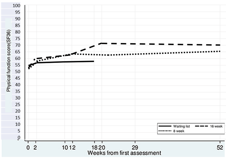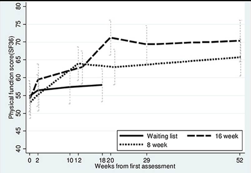 Resultatene av endringer i fysisk funksjon og utmattelse er illustrert med grafen SF-36 Physical Function Subscale. Skalaen går fra 0-100.