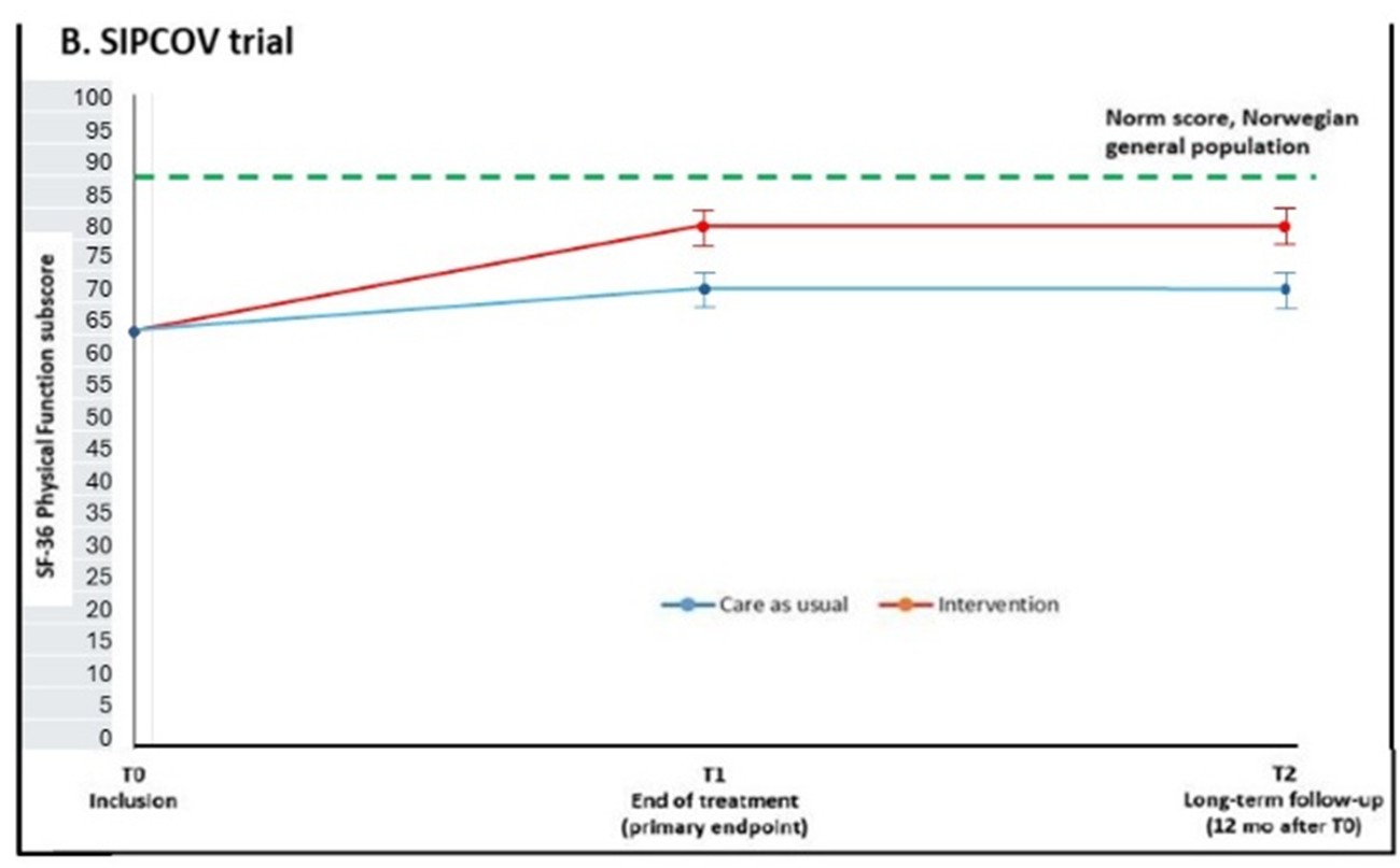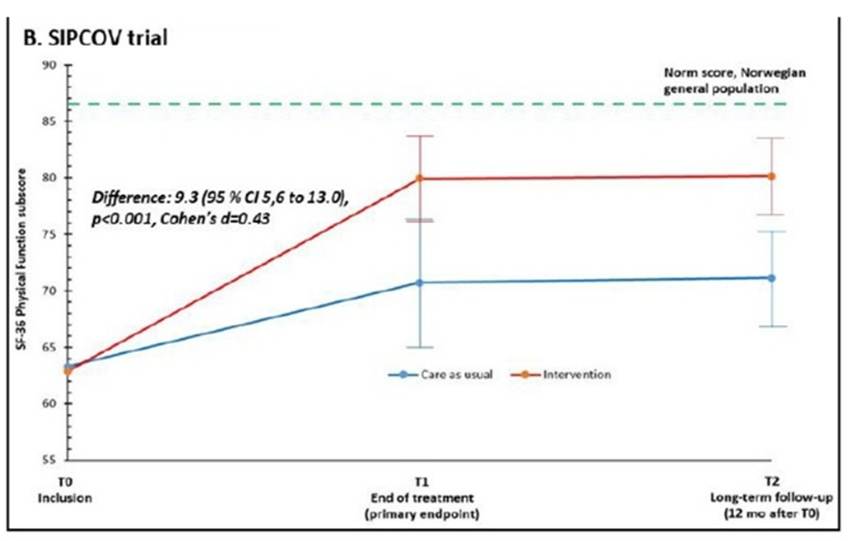 Det hevdes at «En nylig avsluttet randomisert klinisk studie (MINIRICO) av en kort kognitiv atferdsintervensjon (mind-body reprogramming therapy, MBRT) kontra behandling som vanlig ved langvarig COVID viste en gunstig effekt på fysisk funksjon samt andre mål på symptomer og kapasitet. På samme måte viste en annen studie (SIPCOV) med en lignende kort kognitiv atferdsintervensjon ved langvarig COVID bemerkelsesverdig like gunstige effekter med vedvarende effekt over tid.».