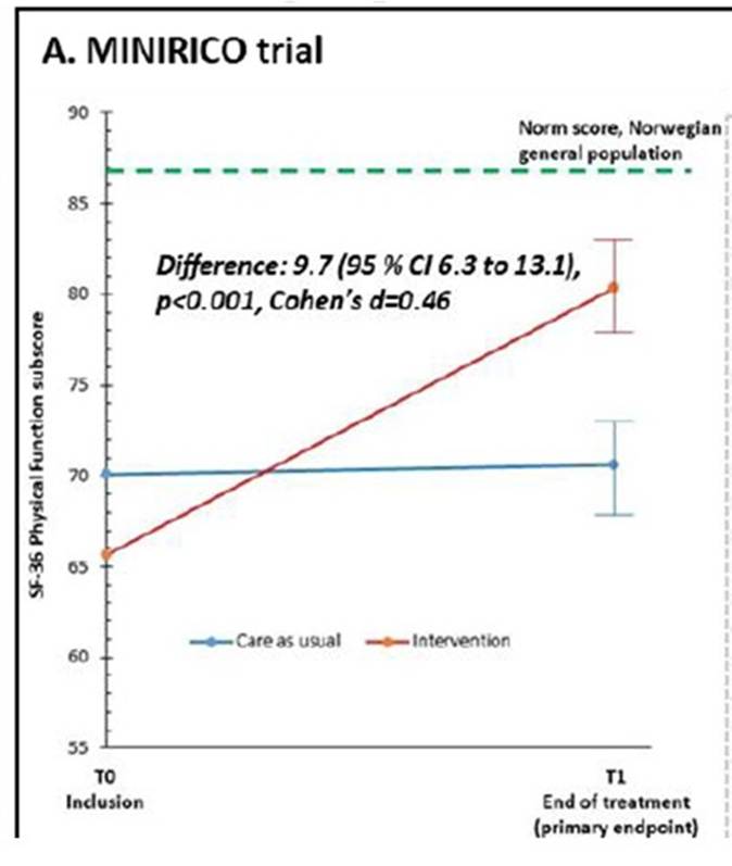 Grensen for klinisk betydningsfull endring for de respektive SF-36 er 10 poeng i henhold til forskerne selv. Begge studiene fikk 9.x i forskjell mellom gruppene. Det vil si at resultatene av SF-36 er under grensen for klinisk betydningsfull endring.