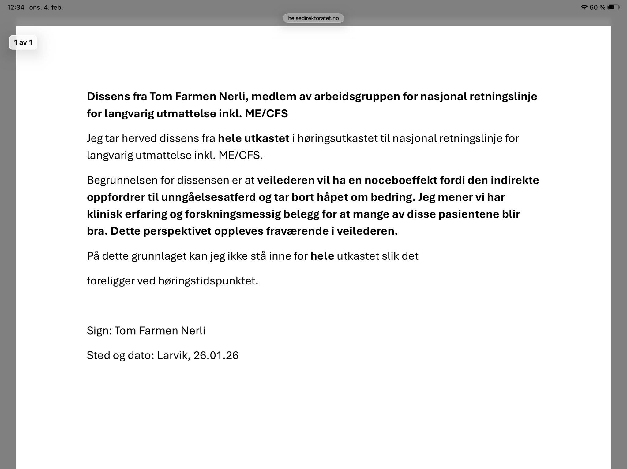 «Jeg aksepterer ikke at retningslinjen blander sammen ME med andre tilstander. Det er ikke hensiktsmessig og vil føre til fortsatt feil og skadelig behandling. Jeg krever en egen retningslinje kun for ME, G93.3.».